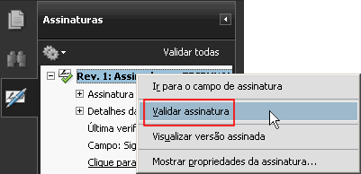 Com o botão direito do mouse, clique sobre Rev. 1: Assinado por (nome da pessoa que assinou) e selecione a opção Validar assinatura.