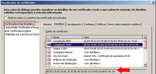 Clique na aba 'Detalhes'. Verifique se o certificado da Autoridade Certificadora Raiz (AC) é o certificado verdadeiro. Para isso, selecione o certificado da AC Raiz Brasileira no lado esquerdo da janela, e verifique se o valor da informação “Compilação SHA1” é 8EFDCABC 93E61E92 5D4D1DED 181A4320 A467A139.