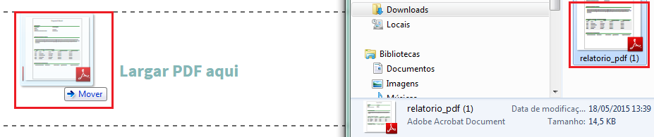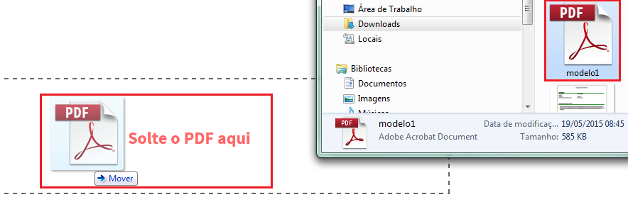 3. Para soltar o arquivo, basta localizá-lo no diretório em que estiver salvo, clicar sobre o mesmo com o botão esquerdo do mouse e, sem soltar o botão, arrastá-lo até área pontilhada, conforme o exemplo abaixo.