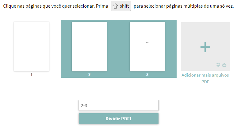 4. Depois selecione as páginas que deseja extrair do documento (o novo documento será gerado somente com as páginas escolhidas). É possível clicar nas páginas que deseja ou informar um intervalo de páginas (ex.: 2-5; 8-12). Confira: